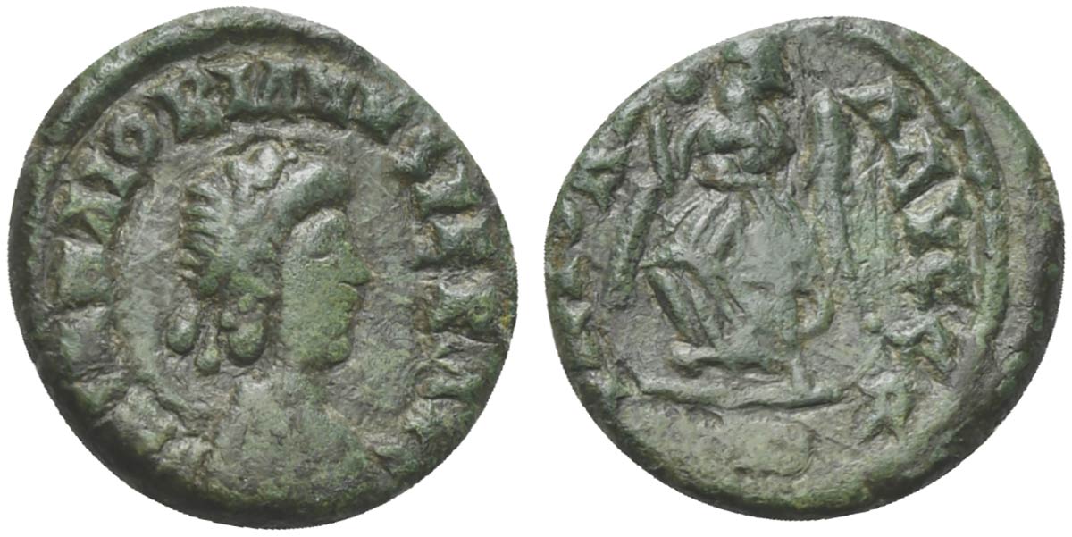 Majorian (457-461), Nummus, Mediolanum. AE (g 1,72; mm 14; h 11). D N IVL MAIORIANVS P F AVG, Pearl-diademed, draped and cuirassed bust r., Rv. VICTORIA AVGGG, Victory standing l., holding wreath and palm frond; MD(?). RIC 2641. G