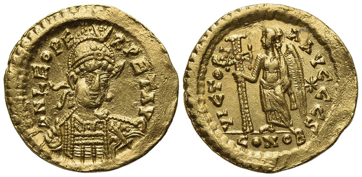 Leo I (457-474), Solidus, Constantinople, AD 462 or 466. AV (g 4,70; mm 21; h 6). D N LEO PE-RPET AVG, Pearl-diademed, helmeted and cuirassed bust facing slightly r., holding spear over shoulder and shield decorated with soldier on horseback motif; Rv. VICTORI A AVGGG, Victory standing l., holding long jeweled cross; star to r.; S//CONOB. RIC 605; Depeyrot 93/1. Good very fine