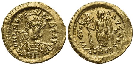 Leo I (457-474), Solidus, Constantinople, AD 462 or 466. AV (g 4,70; mm 21; h 6). D N LEO PE-RPET AVG, Pearl-diademed, helmeted and cuirassed bust facing slightly r., holding spear over shoulder and shield decorated with soldier o