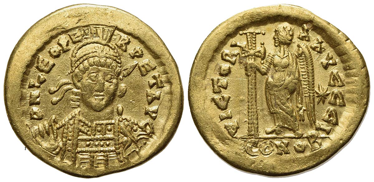 Leo I (457-474), Solidus, Constantinople, AD 462 or 466. AV (g 4,33; mm 21; h 6). D N LEO PE-RPET AVG, Pearl-diademed, helmeted and cuirassed bust facing slightly r., holding spear over shoulder and shield decorated with soldier o
