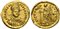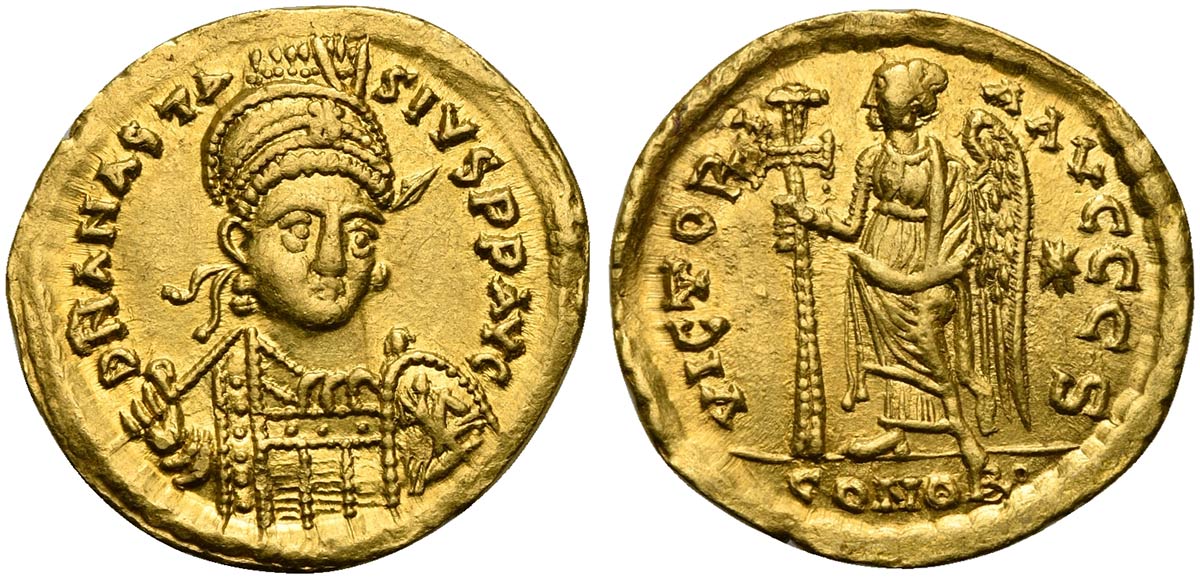 Anastasius I (491-518§); AV Solidus (g 4,42; mm 21; h 7); Constantinople, 492-507; Helmeted and cuirassed bust facing slightly r., holding spear over shoulder and shield; Rv. Victory standing l., holding long, jeweled cross; star
