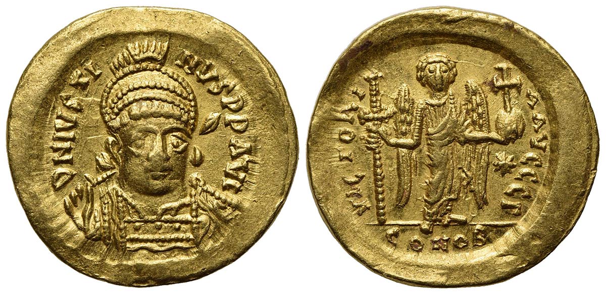 Lotto 1606 | Justin I (518-527); AV Solidus (g 4,50; mm 21; h 6); Constantinople, 519-527. Helmeted and cuirassed bust facing slightly r., holding spear and shield; Rv. Angel standing facing, holding long cross and globus cruciger; star to r.;