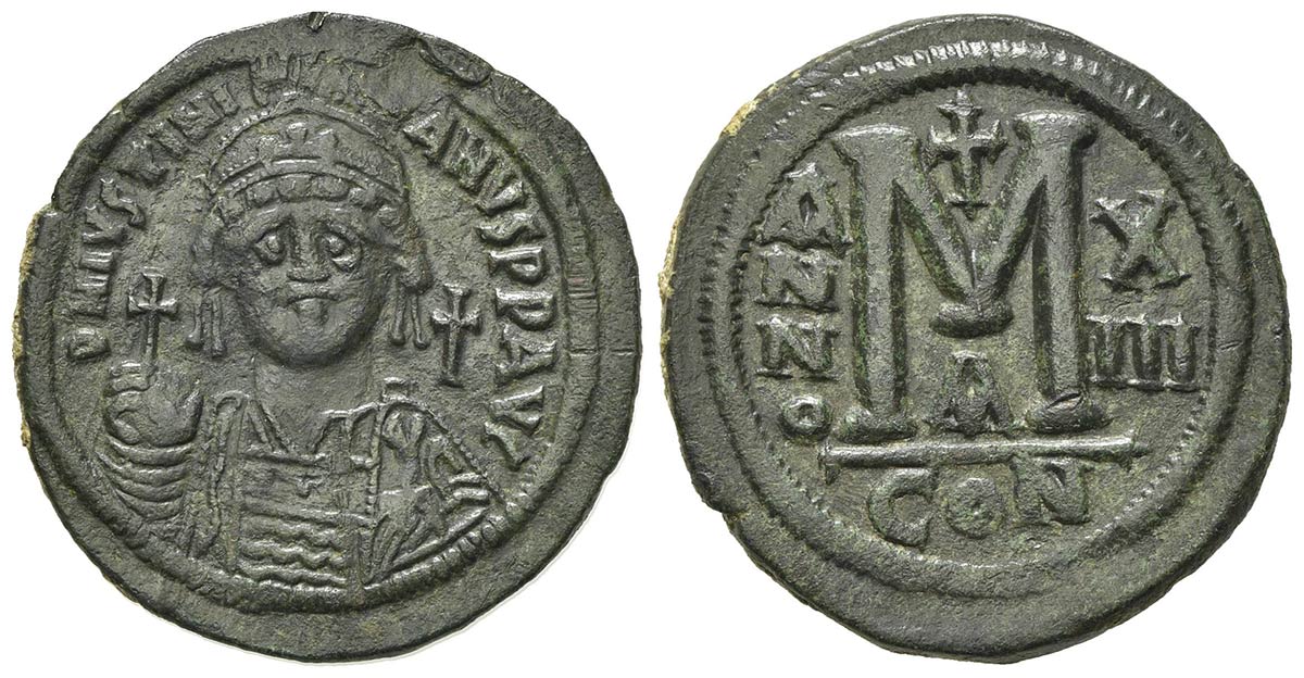 Justinian I (527-565); AE 40 Nummi (g 22.93; mm 38; h 6). Constantinople, year 13 (AD 539/40). Helmeted and cuirassed facing bust, holding globus cruciger and shield with horseman; Rv. Large M, date across fields, A/CON. MIBE 95a;
