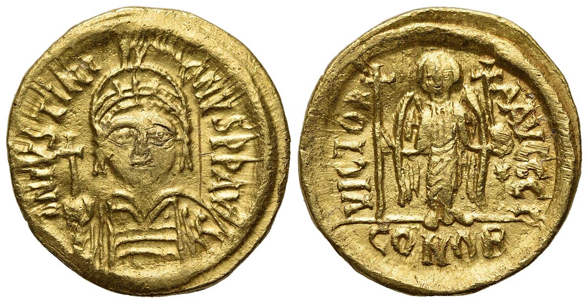 Lotto 1625 | Justinian I (527-565); AV Solidus (g 4,47; mm 20; h 6); Carthage, year 10 (AD 546/7); Helmeted and cuirassed bust facing, holding globus cruciger and shield decorated with soldier on horseback riding r.; Rv. Angel standing facing,