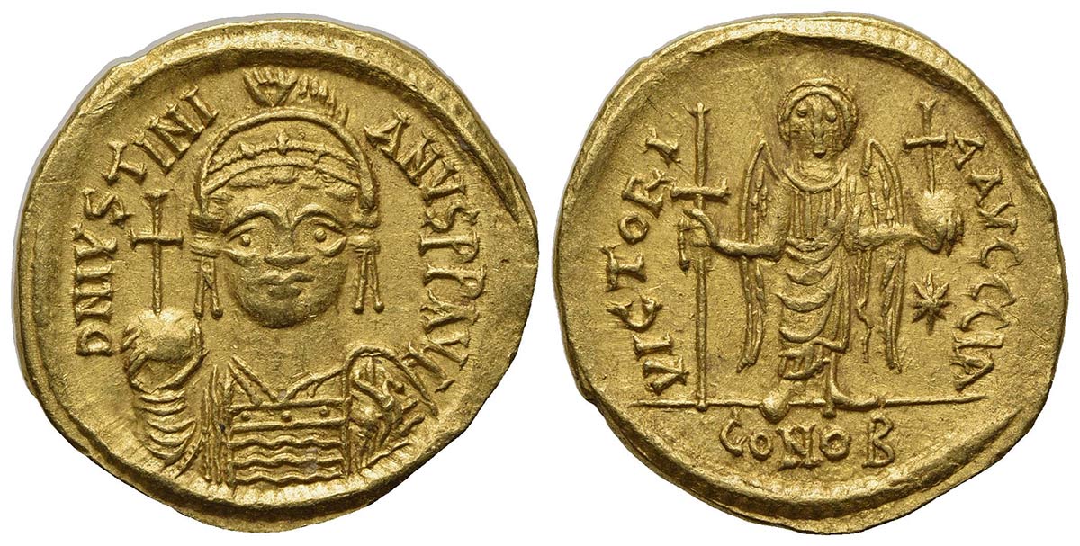 Justinian I (527-565); AV Solidus (g 4,47; mm 20; h 6); Carthage, year 11 (AD 547/8); Helmeted and cuirassed bust facing, holding globus cruciger and shield decorated with soldier on horseback riding r.; Rv. Angel standing facing, holding long cross and globus cruciger; star to r.; IA/CONOB. MIBE 25; DOC 277a; Sear 250. Extremely fine