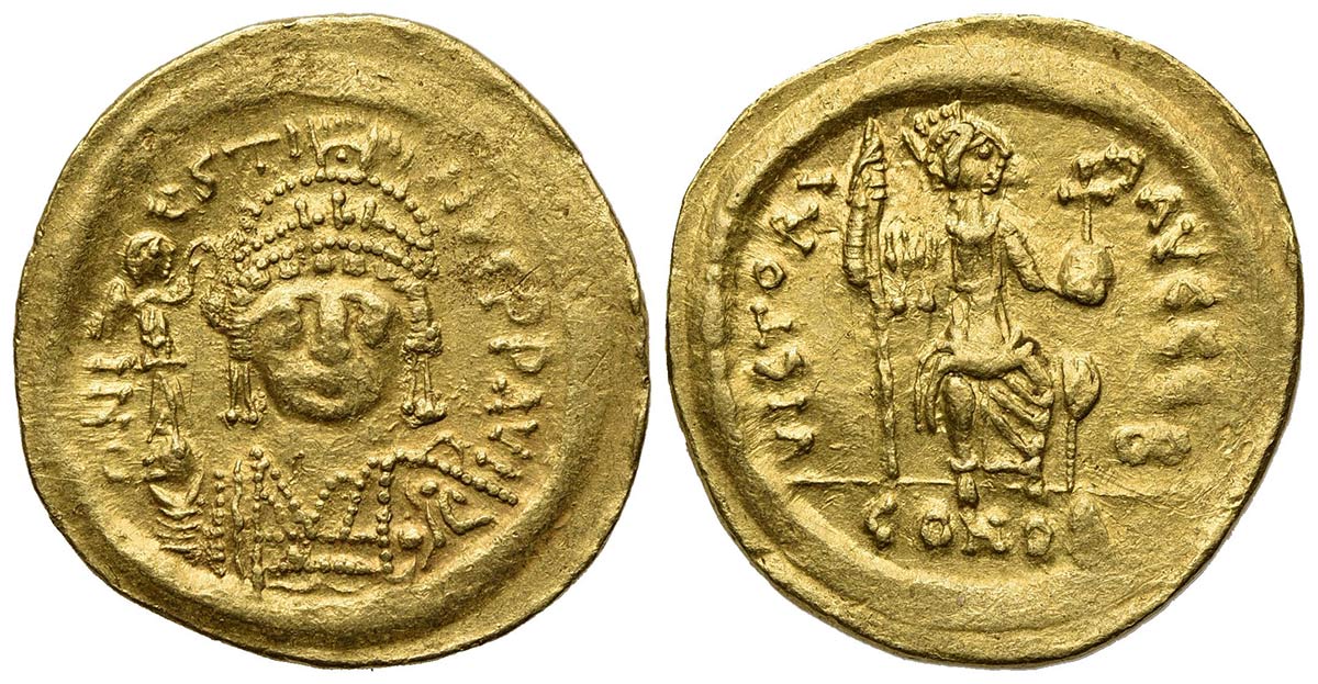 Justin II (565-578); AV Solidus (g 4,43; mm 20; h 6); Constantinople. Diademed, helmeted and cuirassed bust facing, holding globe surmounted by Victory and shield. R/ Constantinopolis seated facing on throne, head r., holding spea