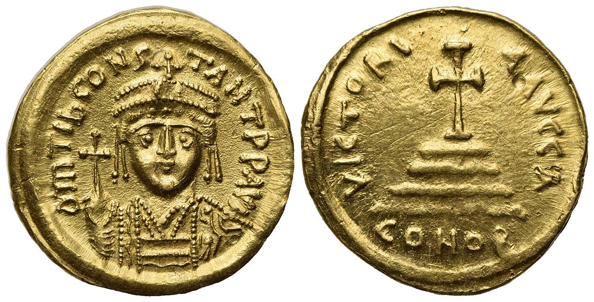 Tiberius II (578-582); AV Solidus (g 4,47; mm 20,5; h 6); Constantinople. Crowned and cuirassed bust facing, holding globus cruciger and shield; Rv. Cross potent set on four steps; A//CONOB. MIBE 4; DOC 4a; Sear 422. Good very fine