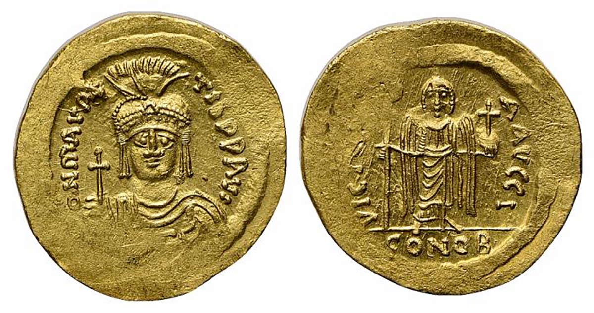 Maurice Tiberius (582-602); AV Solidus (g 4,51; mm 21; h 7); Constantinople, 583/4-602. Helmeted, draped and cuirassed bust facing, holding globus cruciger; Rv. Angel standing facing, holding staff terminating in staurogram and gl
