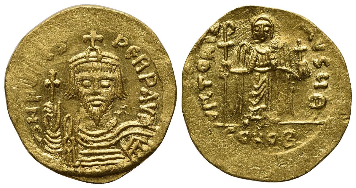 Phocas (602-610); AV Solidus (g 4,49; mm 21; h 6); Constantinople, 607-9. Crowned, draped and cuirassed facing bust, holding cross; Rv. Angel standing facing, holding globus cruciger and long staff terminating in staurogram; Θ//CONOB. MIBE 9; DOC 10i; Sear 620. Very fine - good very fine