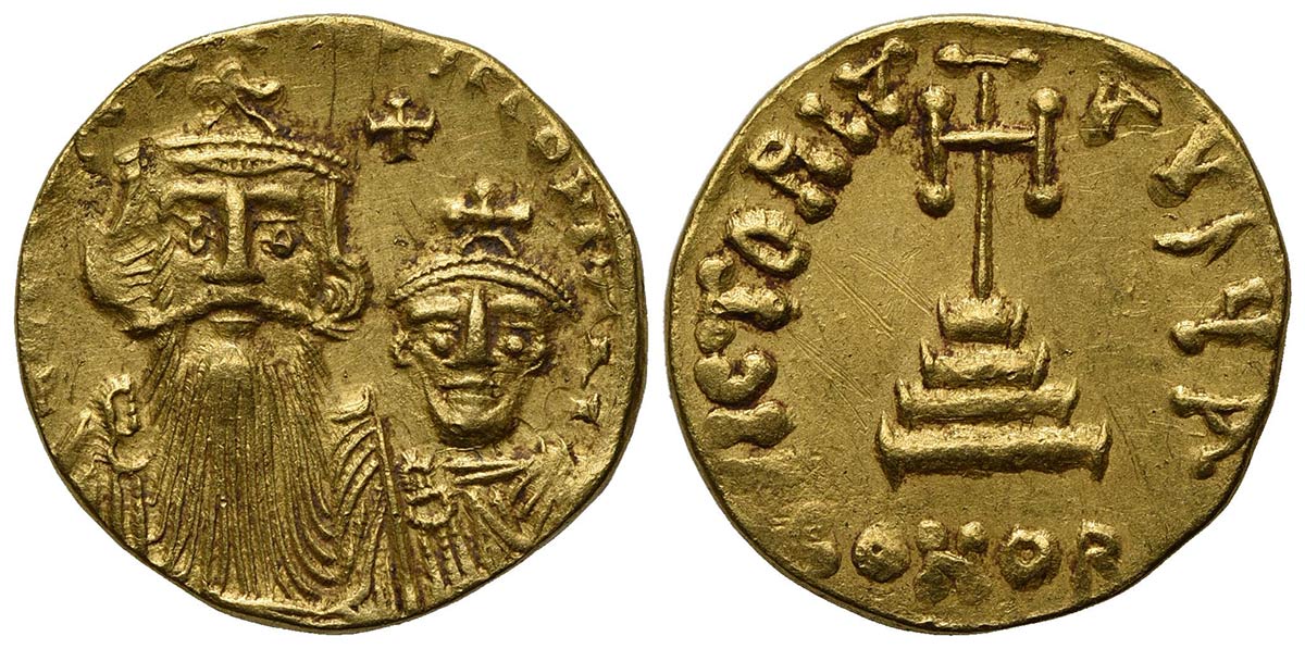 Constans II (641-668); AV Solidus (g 4,38; mm 19,5; h 6); Constantinople, 654-659. Crowned busts of Constans and Constantine facing, both wearing chlamys; cross above; Rv. Cross potent set on three steps; A//CONOB. MIB 26; DOC 25a; Sear 959. Good very fine