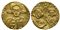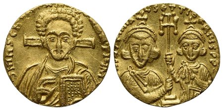 Justinian II with Tiberius (Second reign, 705-711); AV Solidus (g 3,91; mm 19; h 6). Constantinople, 705-711. Facing bust of Christ Pantokrator; cross behind; Rv. Crowned and draped facing busts of Justinian and Tiberius, holding between them a cross potent set on two steps. MIB 2a; DOC 2a; Sear 1414. Ex jewelry, good very fine