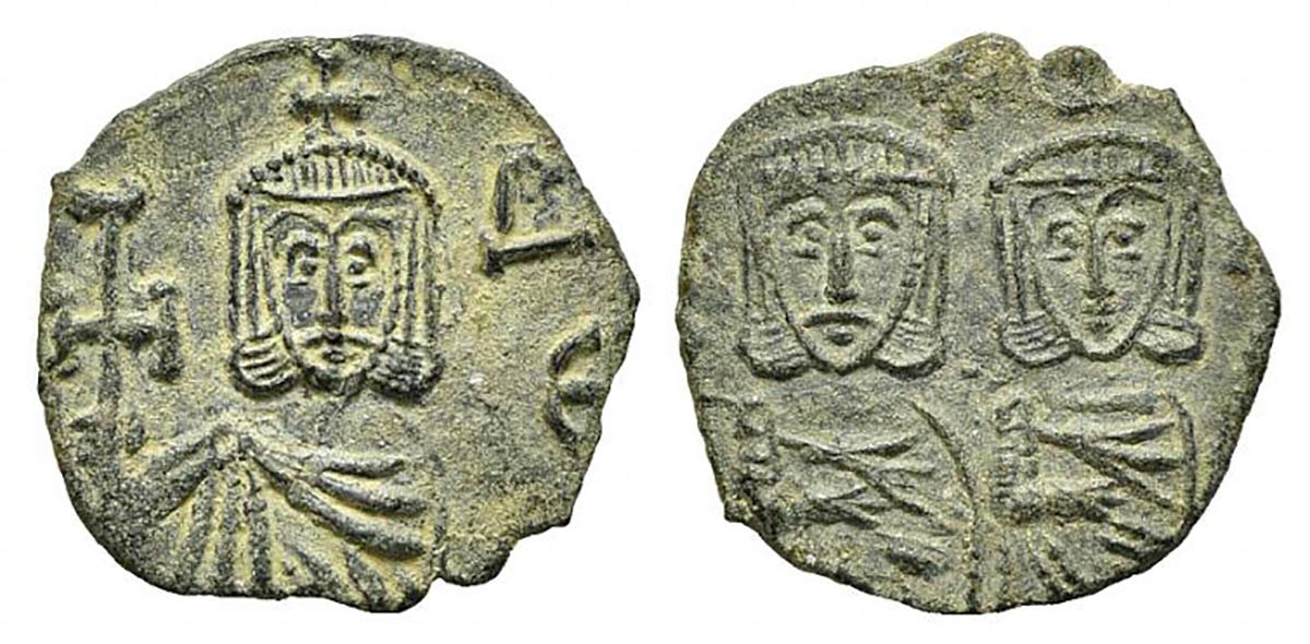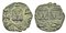 Constantine V (741-775); AE 40 Nummi (g 2,41; mm 18; h 6). Syracuse, 757-775. Crowned facing busts of Constantine and Leo IV, each wearing chlamys and holding akakia; cross between; Rv. Crowned figure of Leo III standing facing, w