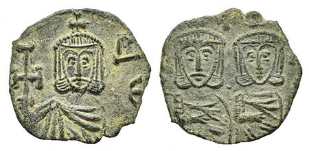 Constantine V (741-775); AE 40 Nummi (g 2,41; mm 18; h 6). Syracuse, 757-775. Crowned facing busts of Constantine and Leo IV, each wearing chlamys and holding akakia; cross between; Rv. Crowned figure of Leo III standing facing, wearing chlamys and holding cross potent. DOC 19; Sear 1569. Green patina, good very fine
