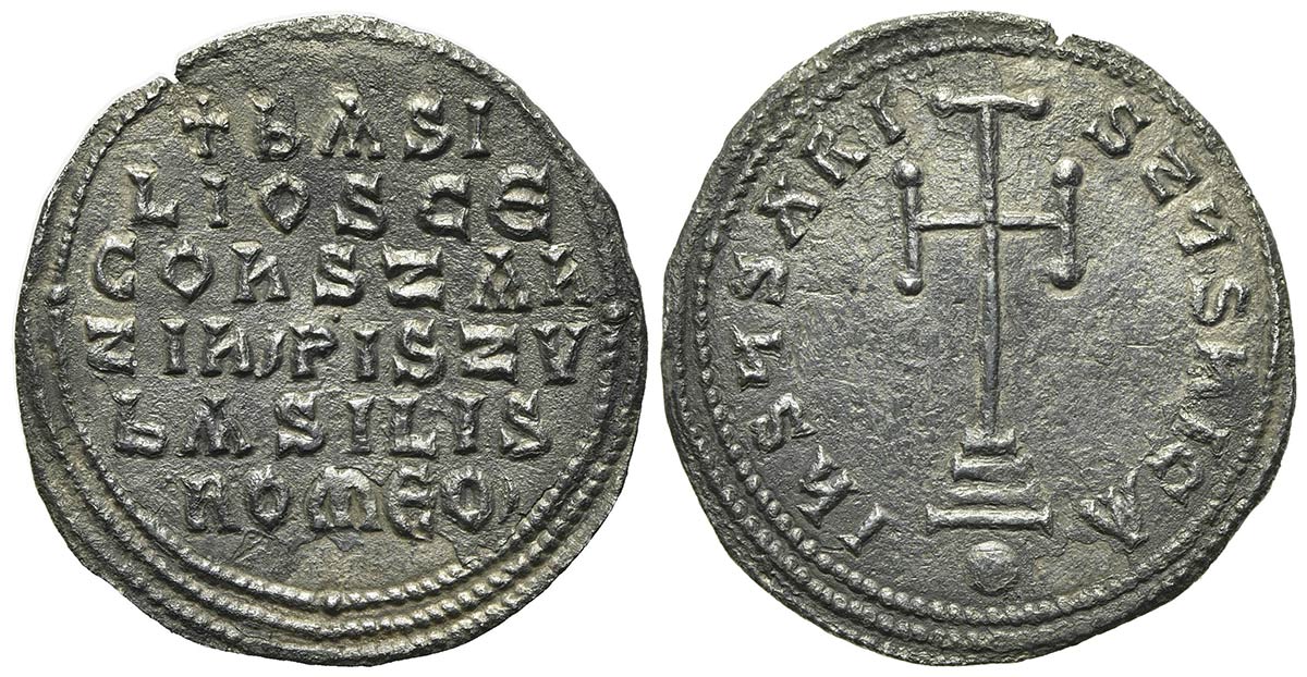 Basil I the Macedonian (867-886); AR Miliaresion (g 2.58; mm 24; h 1); Constantinople, 868-879. Cross potent set on three steps; globus below; Rv. + ЬASI/LIOS CЄ/COҺSTAҺ/TIҺ’ PISTV/ЬASILIS/ROMЄO’ in six lines. DOC 7; Sear 1708. Good very fine