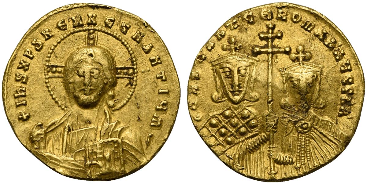 Constantine VII Porphyrogenitus with Romanus II (913-959); AV Histamenon Nomisma (g 4,34; mm 19; h 6); Constantinople, 955-959; Facing bust of Christ Pantokrator; Rv. Crowned facing busts of Constantine VII, wearing loros, and Romanus II, wearing chlamys, holding patriarchal cross between them. DOC 15; Sear 1751. Near extremely fine