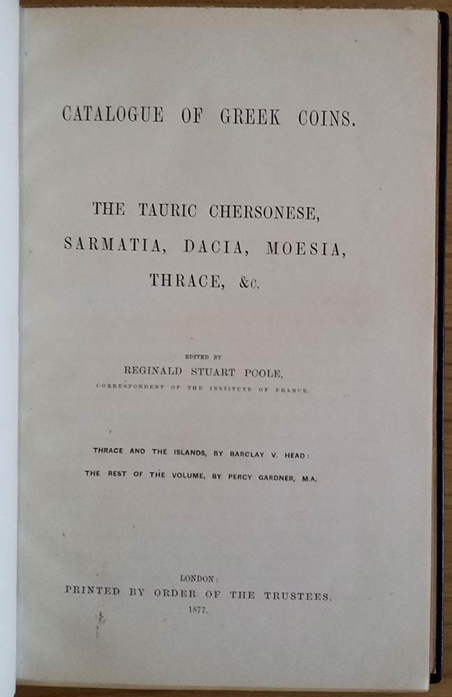 AA.VV. Catalogue of Greek Coins The Tauric Chersonese, Sarmatia, Dacia, Moesia, Thrace ecc. London 1877. Tutta Tela con titolo in oro al dorso, pp. 274, ill. in b/n. Ottimo stato