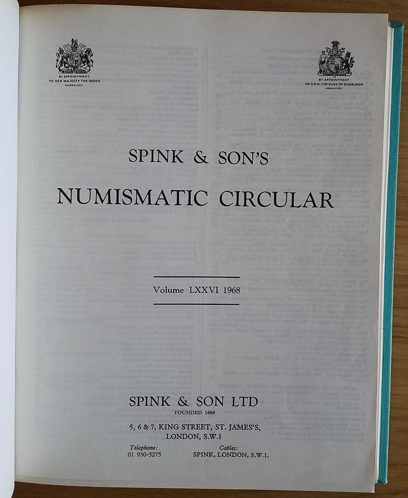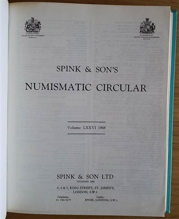 AA.VV. Numismatic Circular Vol. LXXVI, Annata Completa 1968, rilegata in un unico Vol. London Spink & Son 1968. Mezza Pelle, con titolo in oro al dorso,403, ill. in b/n, tavv. Tavv. In b/n. Buono stato