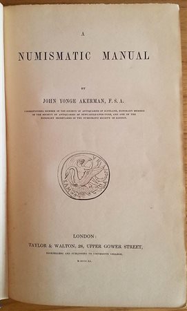 Akerman J.Y. A Numismatic Manual. London Taylor & Walton 1840. Tutta tela con titolo in oro al dorso, pp. 420, tavv. XVII in b/n. Buono stato.