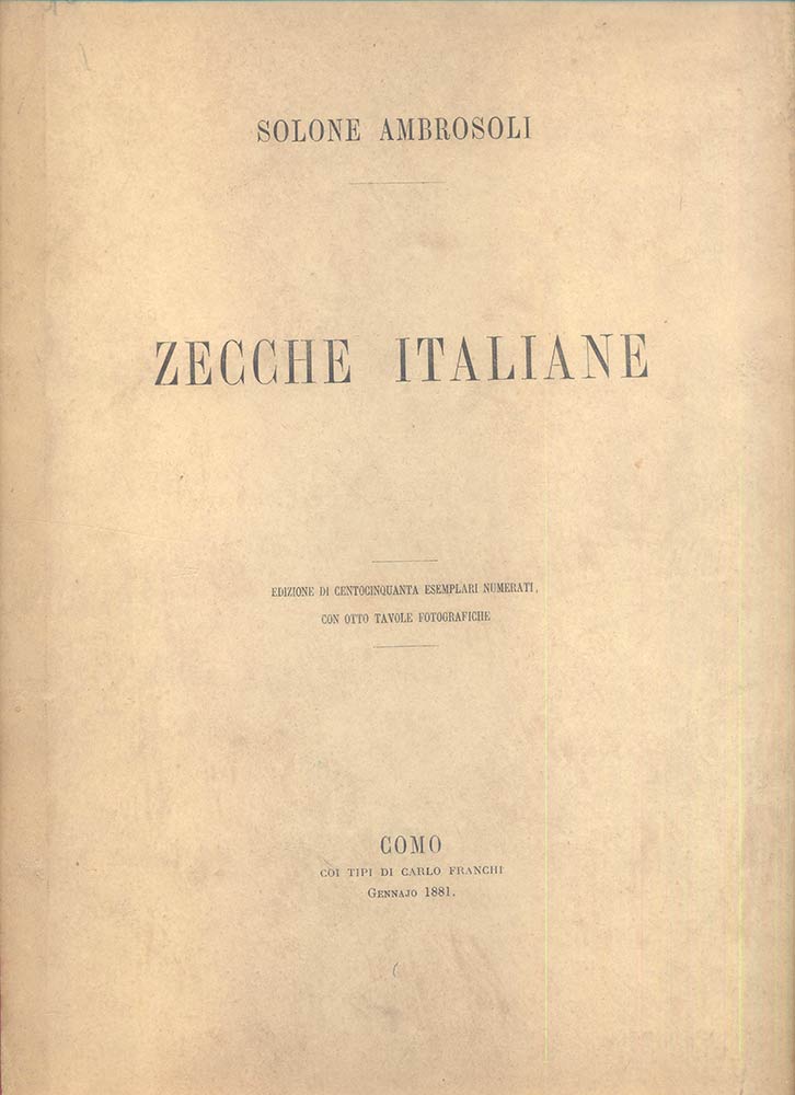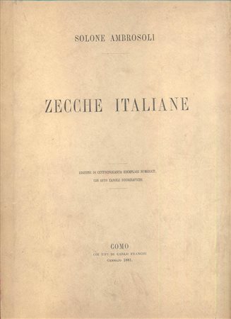 AMBROSOLI S. – Zecche italiane rappresentate nella raccolta numismatica del Ambrosoli Solone. Como, 1881. Pp. xxiv + 53, tavv. 8. Ril. ed. sciupata, ed. di 150 esemplari numerati, molto raro.