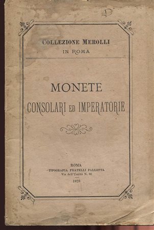 ANONIMO. Collezione Merolli in Roma. Monete Consolari ed Imperatorie. Roma, 1878. Pp. 112. Ril. editoriale sciupata, buono stato, molto raro.