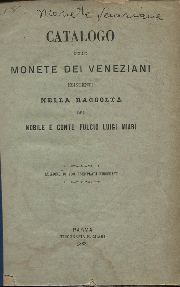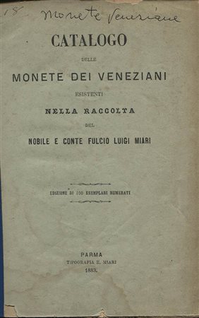 ANONIMO. - Catalogo delle monete dei veneziani esistenti nella raccolta del Nobile e Conte Fulcio Luigi Miari. Parma, 1883. Pp. 26. Ril. \ tela con scritte, buono stato, molto raro.