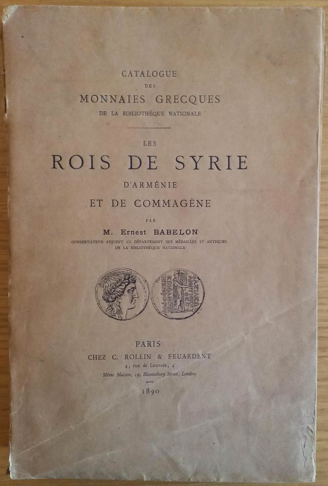 Babelon M.E. Catalogue des Monnaies Grecques de la bibliotheque Nationale. Les Rois de Syrie D' Armenie et de Commagene. Paris Chez C. Rollin & Feuardent 1890. Brossura ed. pp. 268, tavv. XXXII in b/n, ill. in b/n. 3 tavv. Staccat