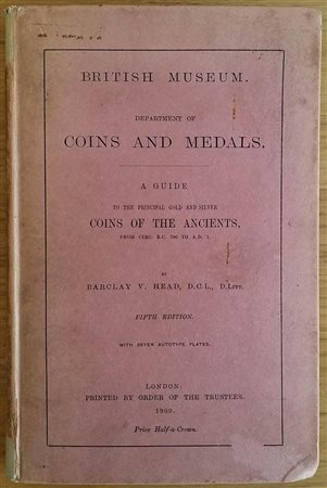 Barclay V. Head British Museum department of Coins and Medals. A guide to the principal Gold and Silver Coins of the Ancients from circ. 700 A.d. 1. London 1909. Cartonato ed. pp. 128, tavv VII in b/n.Buono stato.