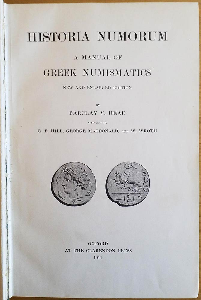 Barclay V. Head Historia Nummorum, A Manual of Greek Numismatics New and enlarged edition. Oxford 1911. Mezzapelle con titolo al dorso, pp. 966, tavv. E ill. in b/n. Buono stato.