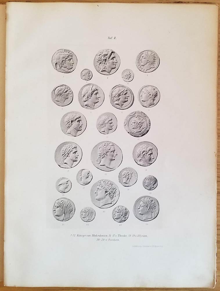 Blumer- Imhoof F. Portratkopfe auf Antiken Munzen Hellenischer und Hellenisierter Volker mit Zeittafeln der Dynastien des Altertums Nach Ihren Munzen. Leipzig 1885. Cartonato 95, tavv. VIII in b/n. Buono stato