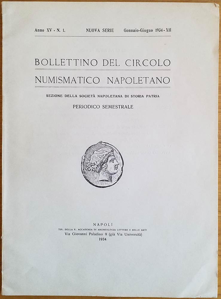 Bollettino del Circolo Numismatico Napoletano Anno XV N 1 Gennaio-Giugno 1934. Napoli Tip. della R. Accademia di archeologia lettere e belle arti, 1934. Brossura ed. pp. 59, ill. in b/n. Dall'Indice: Indizi numismatici del fervore