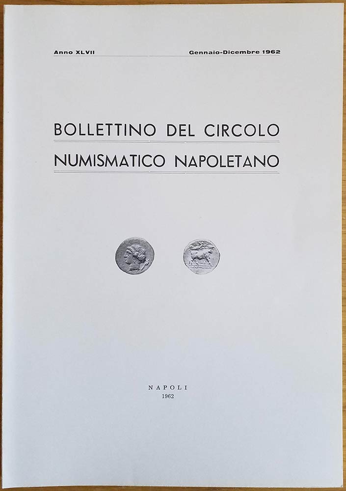 Bollettino del Circolo Numismatico Napoletano. Anno XLVII Gennaio-Dicembre 1962. Brossura ed. pp. 94, tavv. V in b/n, ill. in b/n. Dall' Indice: Domenico Priori, Le monete di Pallano e il luogo ove sorse la zecca. Pietro Ebner, De