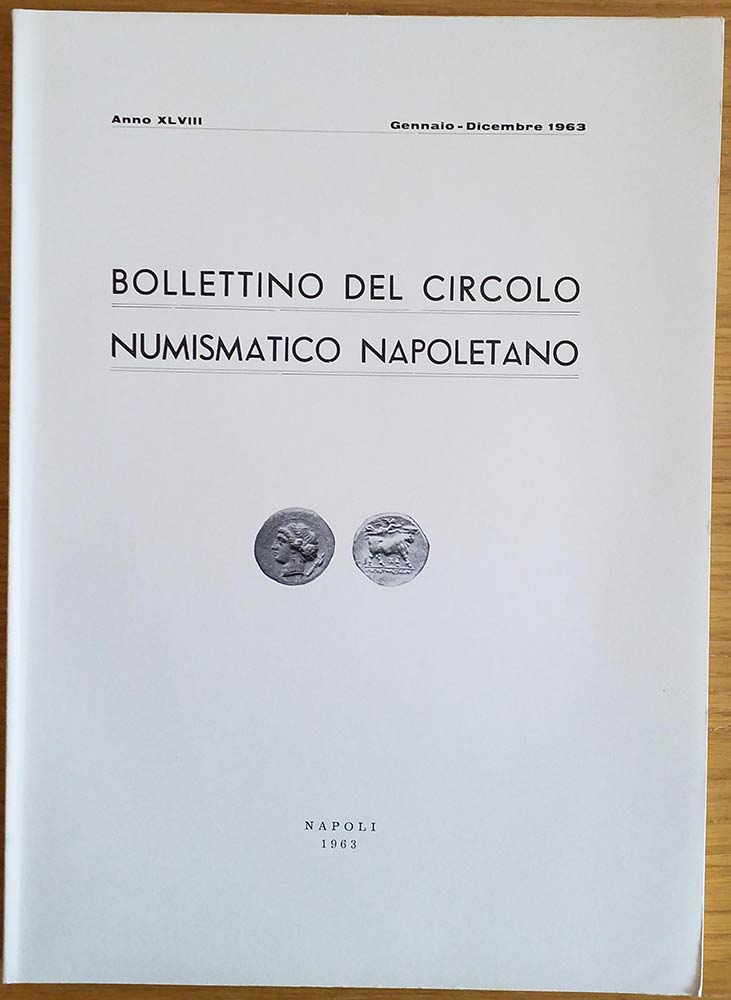 Bollettino del Circolo Numismatico Napoletano. Anno XLVIII Gennaio-Dicembre 1963. Brossura ed. pp. 132, tavv. V in b/n, ill. in b/n. Dall’Indice: Giovanni Bovi, Il Circolo numismatico napoletano; Domenico Priori, Nuovi argomenti sulla coniazione del denario nel 263 a. C.; Giovanni Bovi, Le monete di Napoli sotto Carlo V; Michele Pannuti, Le monete auree borboniche napoletane del XIX secolo; Agnese Catemario di Quadri, Francesco I di Borbone in Francia e in Ispagna (1829-1830); Roberto Volpes, La medaglia della Colonna di San Domenico di Palermo; Recensioni; Elenco dei soci. Buono stato