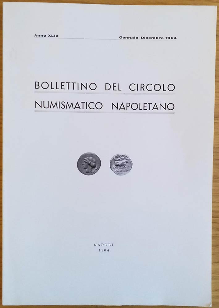 Bollettino del Circolo Numismatico Napoletano. Anno XLIX Gennaio-Dicembre 1964. Brossura ed. pp. 112, tavv. VI in b/n, ill. in b/n. Dall' Indice: G. Bovi - Le monete di Napoli sotto Filippo II (1554-1598) M. Pannuti - Le lettere R