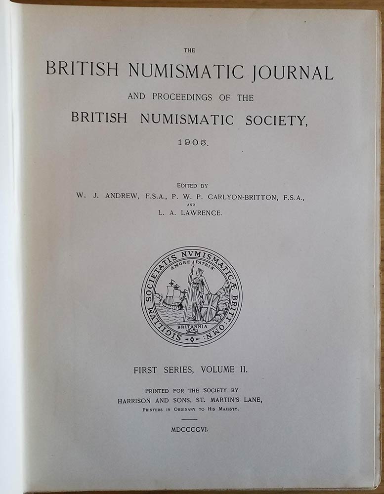 British Numismatic Journal and Proceedings of the British Numismatic Society 1905, First Series Vol. II. Harrison and Sons 1906. Tutta Tela con titolo in oro al dorso,pp. 562, ill. in b/n, tavv. In b/n. Buono stato