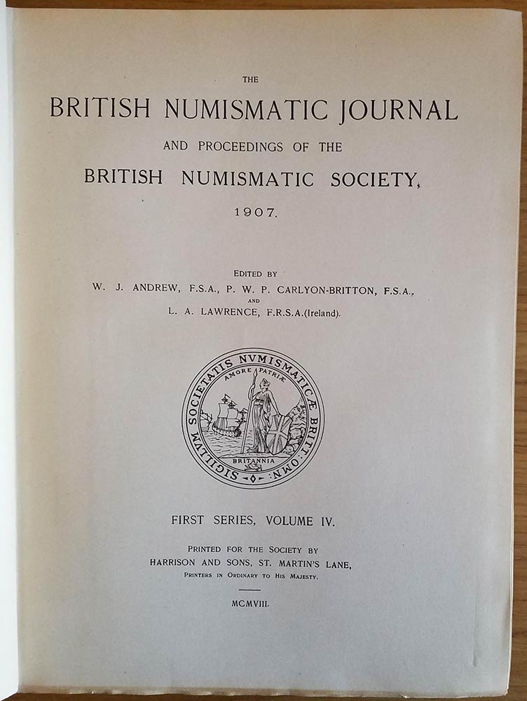 British Numismatic Journal and Proceedings of the British Numismatic Society 1907, First Series Vol. IV. Harrison and Sons 1908. Tutta Tela con titolo in oro al dorso, pp. 439, ill. in b/n, tavv. In b/n. Buono stato