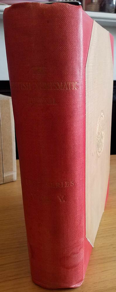 British Numismatic Journal and Proceedings of the British Numismatic Society 1908, First Series Vol. V. Harrison and Sons 1909. Tutta Tela con titolo in oro al dorso, pp. 523, ill. in b/n, tavv. In b/n.Buono stato-.