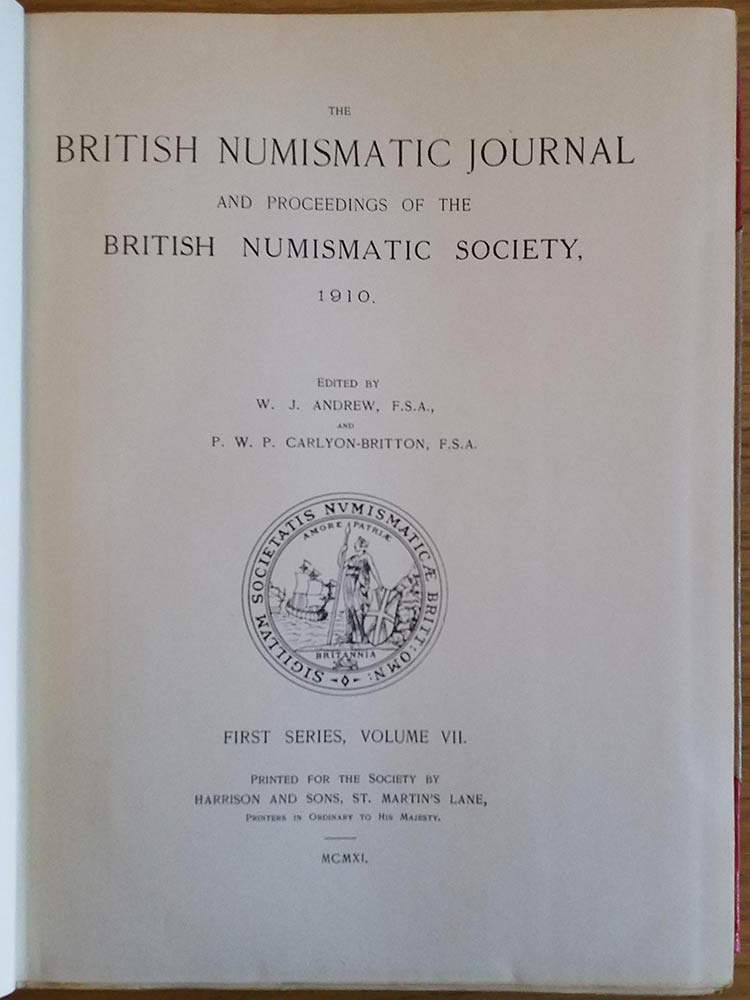 British Numismatic Journal and Proceedings of the British Numismatic Society 1910, First Series Vol. VII. Harrison and Sons 1911. Tutta Tela con titolo in oro al dorso, pp. 457, ill. b/n, tavv. In b/n. Buono stato