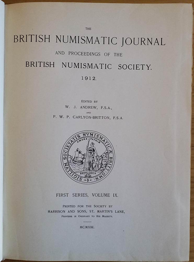 British Numismatic Journal and Proceedings of the British Numismatic Society 1912, First Series Vol. IX Harrison and Sons 1913. Tutta Tela con titolo in oro al dorso, pp. 485, ill. in b/n, tavv. In b/n. Buono ststo