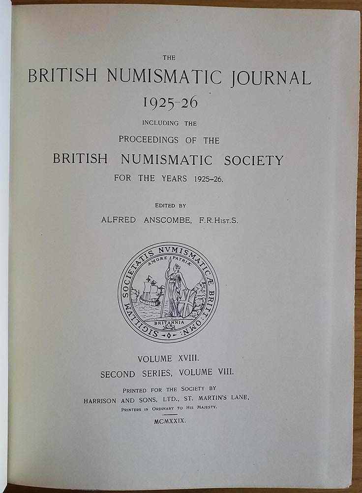 British Numismatic Journal 1925-26. Including the Proceedings of the British Numismatic Society for the year 1925-26. Volume XVIII – Second Series Vol. VIII. Harrison and Sons 1929.Tutta Tela con titolo in oro al dorso, pp. 393,
