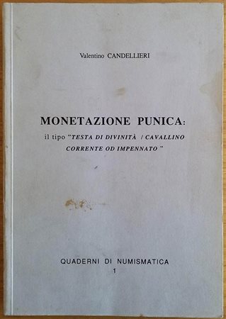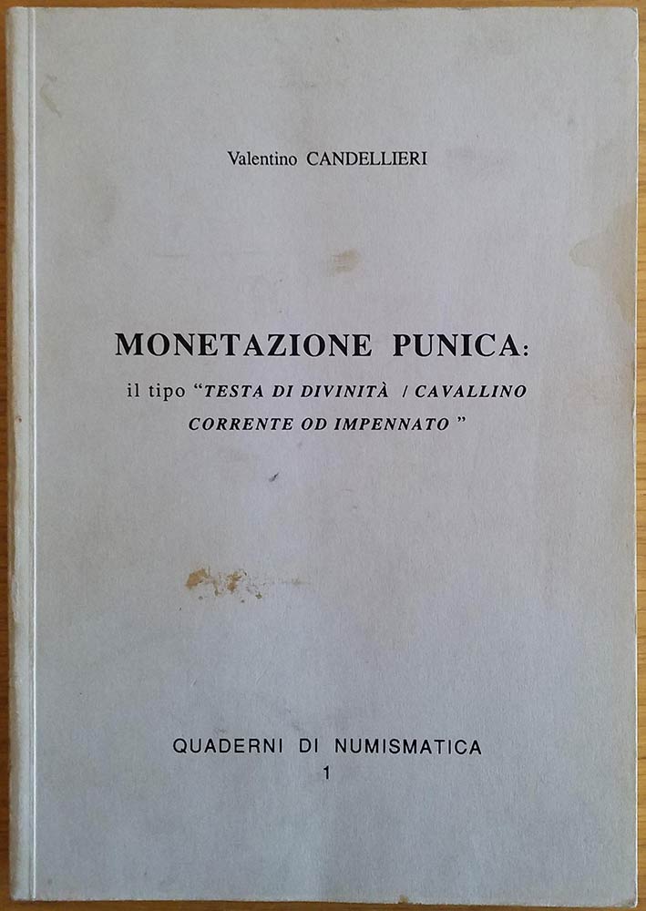 Candellieri V. Monetazione Punica: il tipo “Testa di Divinità / Cavallino Corrente od Impennato”. Quaderni di Numismatica 1. Milano 1989. Brossura ed. pp. 100, tavv. XXIII in b/n. Buono stato