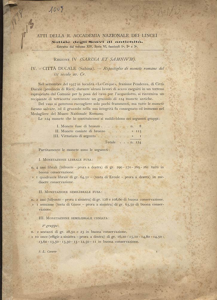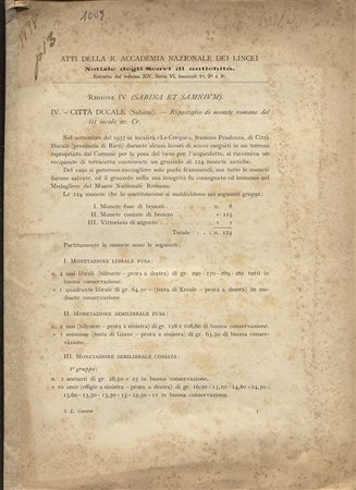CESANO L. – Ripostiglio di monete romane del III secolo av. Cr. Roma, 1938. Pp. 10. Brossura ed. Sciupata, buono stato. Monete romane fuse e repubblicane. Raro.