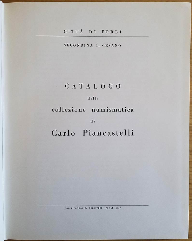 Cesano L. – Catalogo della collezione numismatica di Carlo Piancastelli. Forlì, 1957. pp. 451, tavv. 30 splendido catalogo di una collezione di importanti e belle monete romane imperiali. Ottimo stato