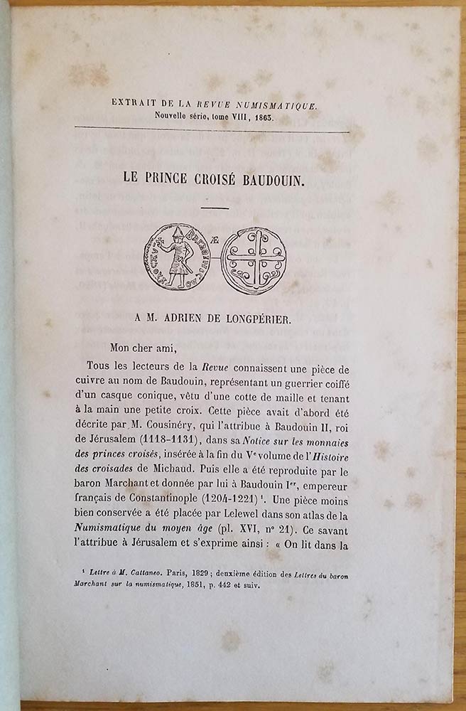 De Longperier A.H. Le Prince Croise Baudoin.1863 Monnaies des Marquis D' Incisa. 1864. Denier De Witekind VI, Comte de Swalenberg 1865. Lettre a M.F. De Saulcy sur quelques Monnaies Byzantines. 1865. Brossura pp. 25, ill. in b/n,