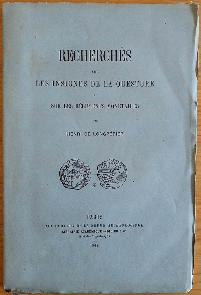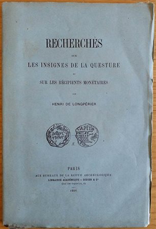De Longperier H. Recherches sur Les Insignes de la Questure et sur les Recipients Monetaires. Paris 1868. Brossura ed. pp. 95, tavv. 3 in b/n. Intonso. Buono stato