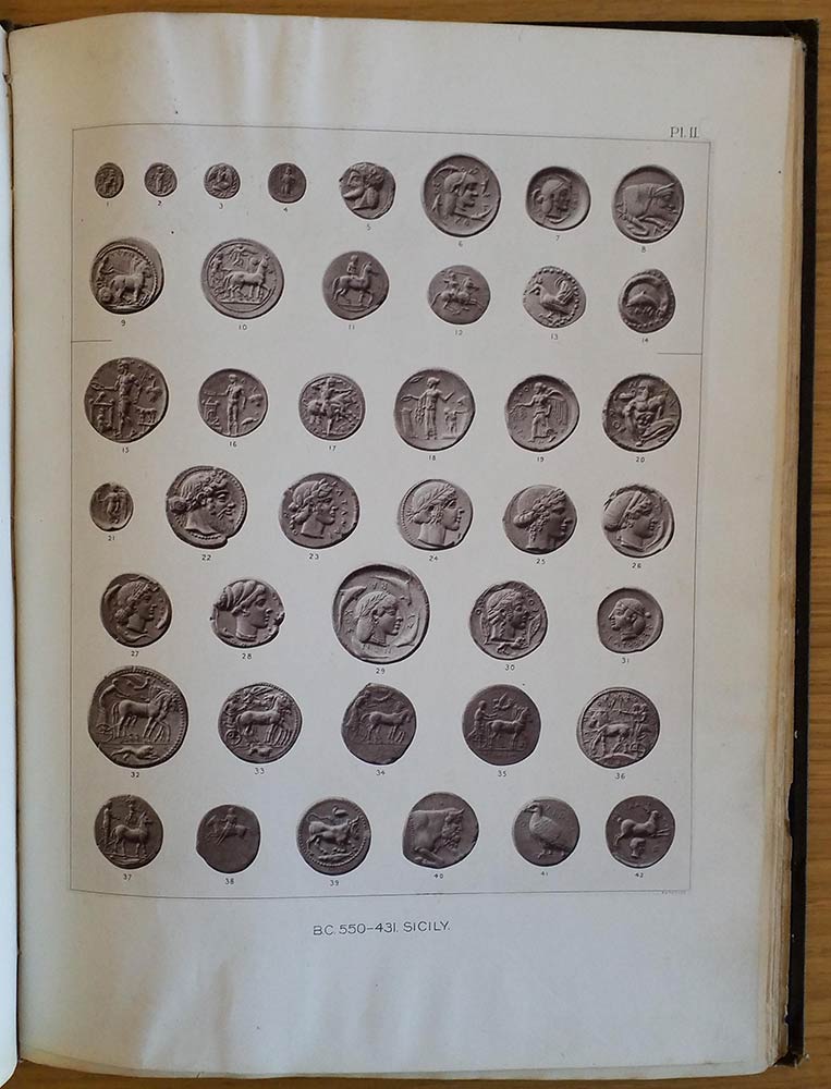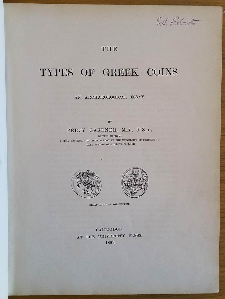 Gardner P. The types of Greek Coins an Archaeological Essay. Cambridge at the University press 1883. Tela ed. Con titolo e fregi in oro al dorso e al piatto pp. 218, tavv. XVI in b/n. Buono stato