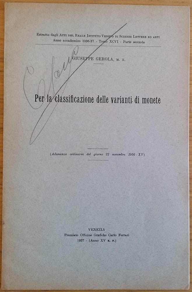 Gerola G. Per la classificazione delle varianti di Monete. Estratto dagli Atti del Reale Istituto di Scienze Lettere ed Arti. Anno Accademico 1936-37- Tomo XCVI – Parte Seconda. Venezia Ferrari C. 1937. Brossura ed. pp. Da 95 a 107. Buono stato