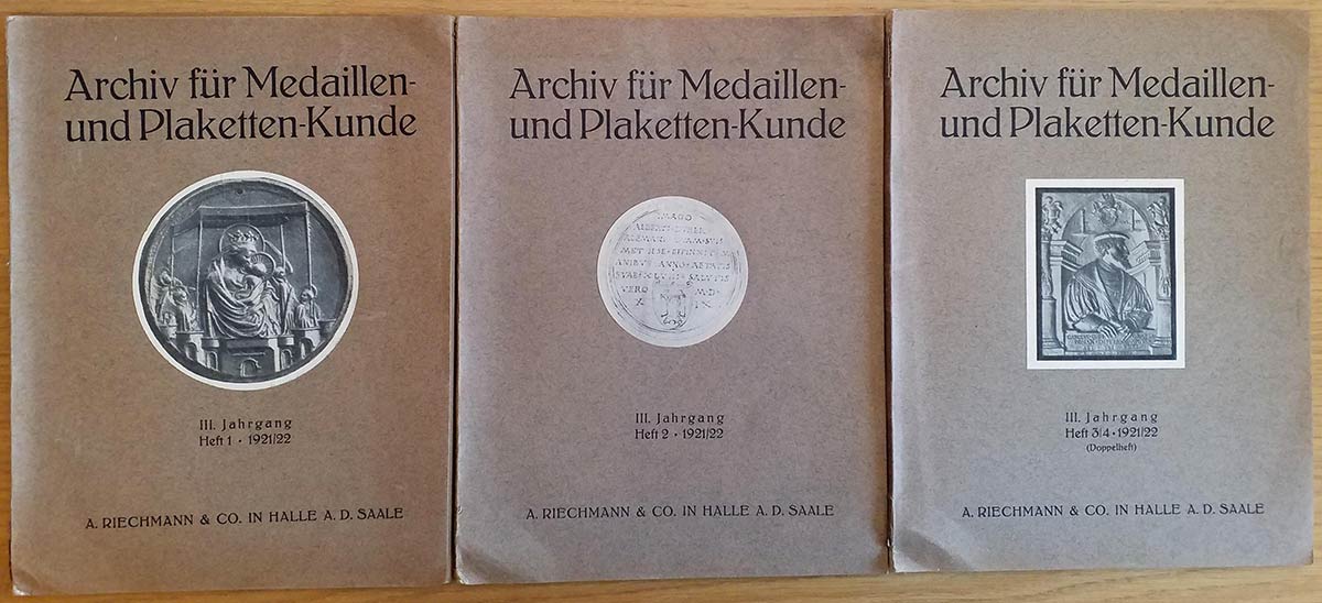 Habich G. - Bernhart M. - 3 Voll. Archiv fur Medaillen und Plaketten-Kunde.1921-22 Annata completa. Brossura ed. pp. 156 tavv. XIV in b/n. Buono stato.