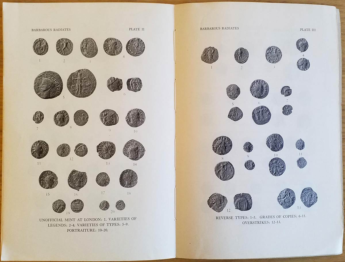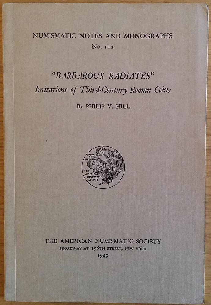 Hill P. V. – “Barbarous radiates”. Imitations of Third-Century Roman Coins. Numismatic Notes and Monographs No. 112. The American Numismatic Society, New York 1949. Brossura ed. pp. 44, tavv. IV in b/n. Buono stato