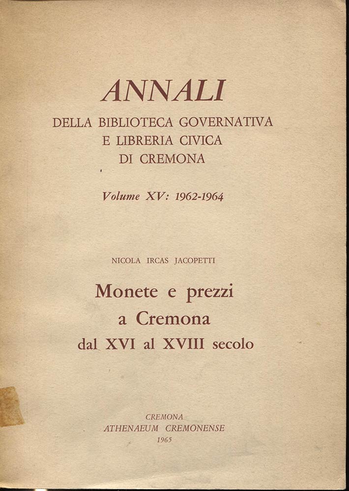 JACOPETTI N. I. – Monete e prezzi a Cremona dal XVI al XVIII secolo. Cremona 1965. Pp. 268. Ril. editoriale, buono stato. molto raro