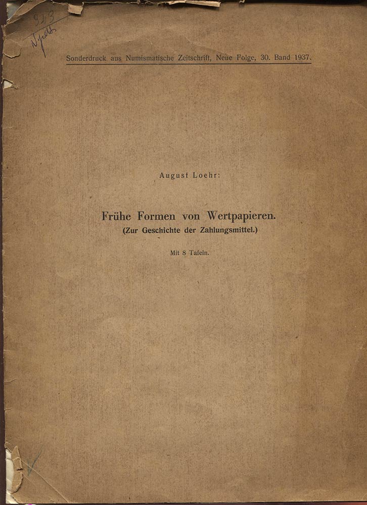 Lotto 1990 | LOEHR A. – Fruhe formen von Wertpapieren ( zur geschichte der zahiungsmitel. Wien, 1937. Pp. 15, tavv. 8. Ril. ed. Sciupata, buono stato, raro.